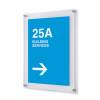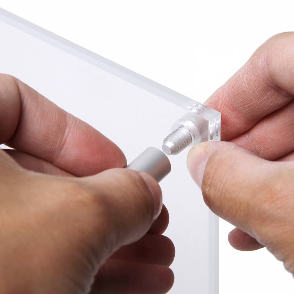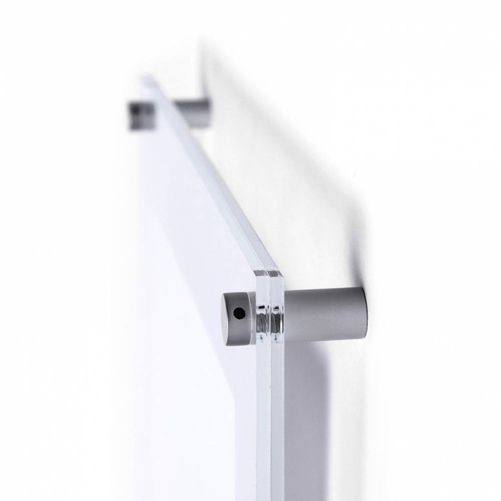 Adjon elegáns megjelenést poszterének két falra szerelhető, 3 mm-es, polírozott élű akrilpanellel. Az átlátszó akril panelek ezüst eloxált gombos rögzítéssel prémium megjelenést kölcsönöznek üzenetének. Az elegáns szendvicskonstrukció 2 db 3 mm vastag átlátszó akril panelből és 4 db 19 mm átmérőjű ezüst eloxált faltávtartóból áll. Ideális irodákban, vendéglátásban vagy nyilvános helyiségekben.