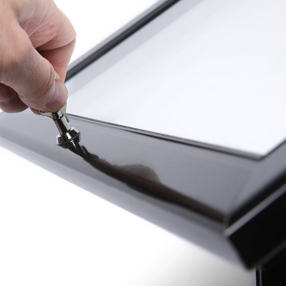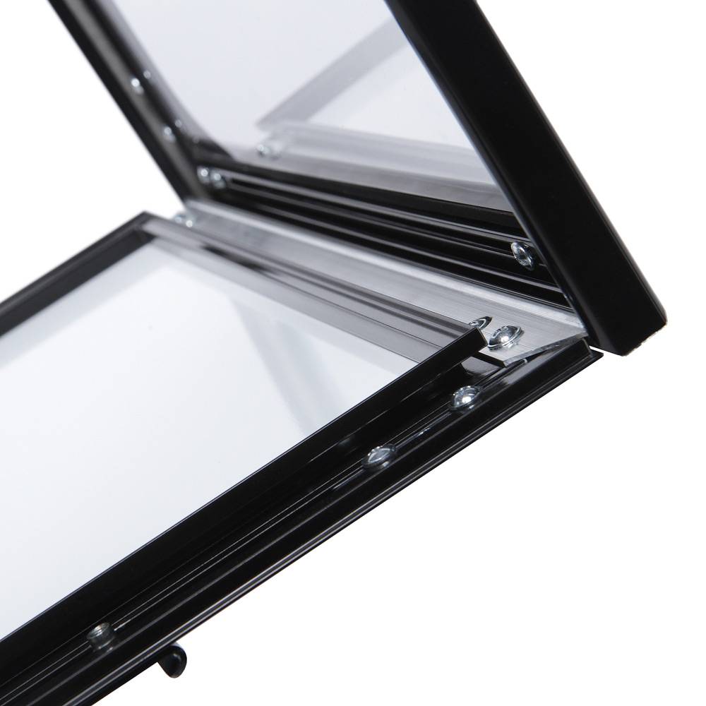 Az elegáns MENUSTAND Fekete Menütartó Állvány tökéletes megoldás, hogy kiemelje étlapját vagy árlistáit. Ez a zárható, csuklós előlappal ellátott fekete menüvitrin ideális beltéri és fedett kültéri használatra is. Az alumínium vitrin mágneses rögzítési lehetőségei biztosítják, hogy étlapját, napi ajánlatait vagy árlistáit könnyedén és biztonságosan helyezze el, így minden oldal jól látható lesz. A beépített LED szalagok látványos megvilágítást nyújtanak, garantálva, hogy étlapja ragyogóan vonzza a vendégek figyelmét. Ez az állvány stílusos és praktikus módon emeli ki étterme kínálatát.