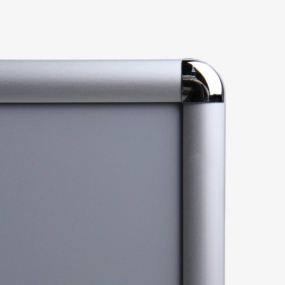 • Egy- vagy kétoldalas plakátkeret állvány, szögletes vagy lekerekített sarkak Stabil - festett szögletes fémtalp, ellipszis alakú, ezüst eloxált alumínium oszloppalKönnyű posztercsere – 25 mm-es alumínium plakátkeret3 x A4-es, festett acél brosúrapolc felszerelésének lehetősége, mindkét oldalra