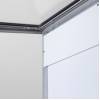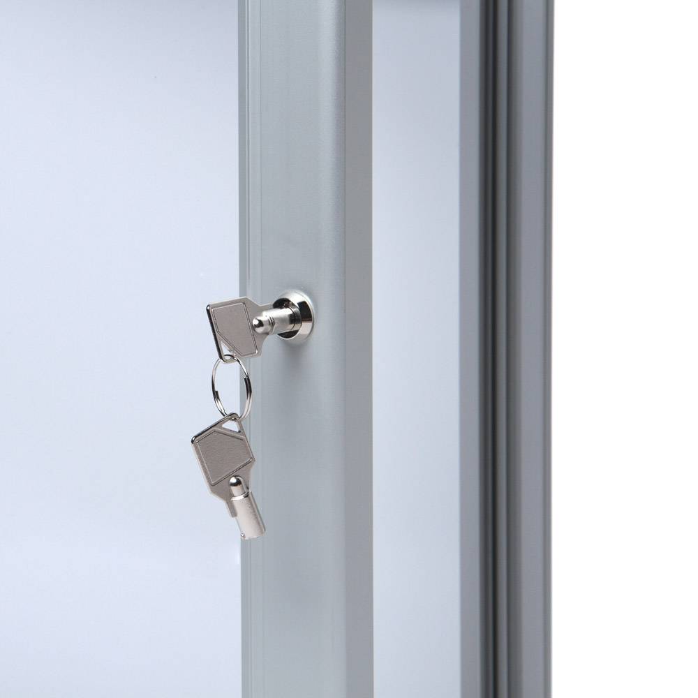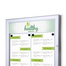 A logópanel funkció lehetővé teszi, hogy tovább növelje márkája jelenlétét. Az alumíniumból készült, fehérre lakkozott felső kártyára nyomtathatja logóját vagy márkáját, amely így jól láthatóan megjelenik a vitrin tetején. A felső kártya strapabíró kialakítása garantálja, hogy az időjárás és a külső behatások sem csökkentik a megjelenés minőségét. A kártya rögzítése két kis csavarral történik, és üvegajtó védi a nyomtatott felületet, így az mindig tisztán látható marad.