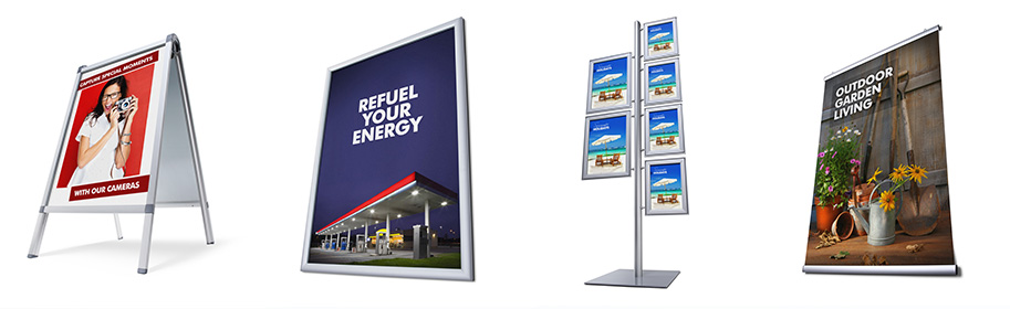 Poszterkeretek, járdai jelzések, hirdetőtáblák, vitrinek, digitális jelzések, prospektus állványok, banner rendszerek, útjelző táblák és sok más reklámkommunikációs rendszerek, amelyeket használhat: