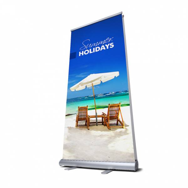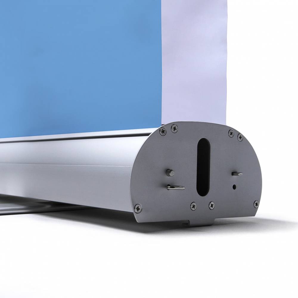 Elegáns alumínium roll-up állvány nagyfokú stabilitással. Az egyszerű roll-up kialakítás egy termék vagy hirdetési üzenet hosszú távú bemutatására szolgál. Az alumínium állványhoz hordtáskát is mellékelünk a könnyű szállítás és védelem érdekében. A csomag csak Roll-Up konstrukciót tartalmaz nyomtatott banner nélkül.