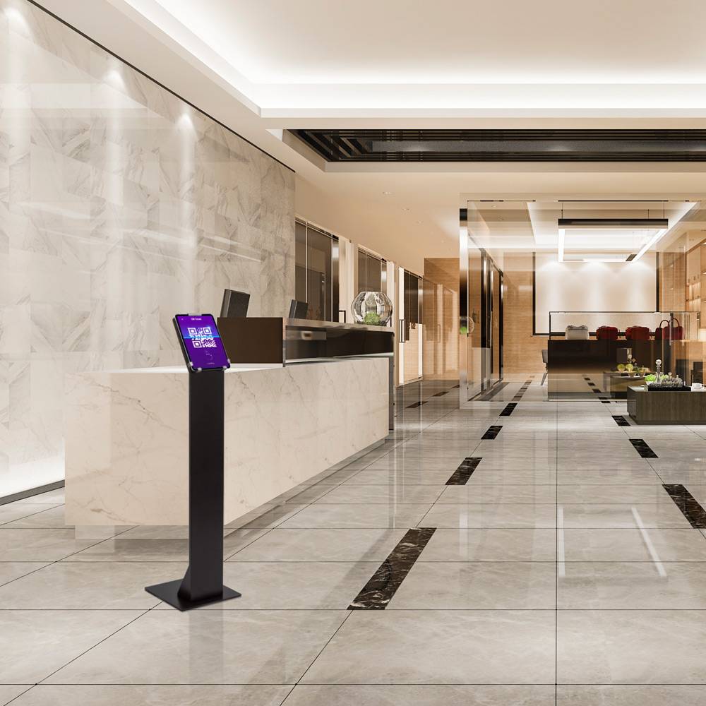 Robusztus acél vázszerkezet: A fekete színű, acélból készült állvány prémium megjelenést biztosít. Kiválaszthatja, hogy álló vagy fekvő módban szeretné megjeleníteni a tablettet.