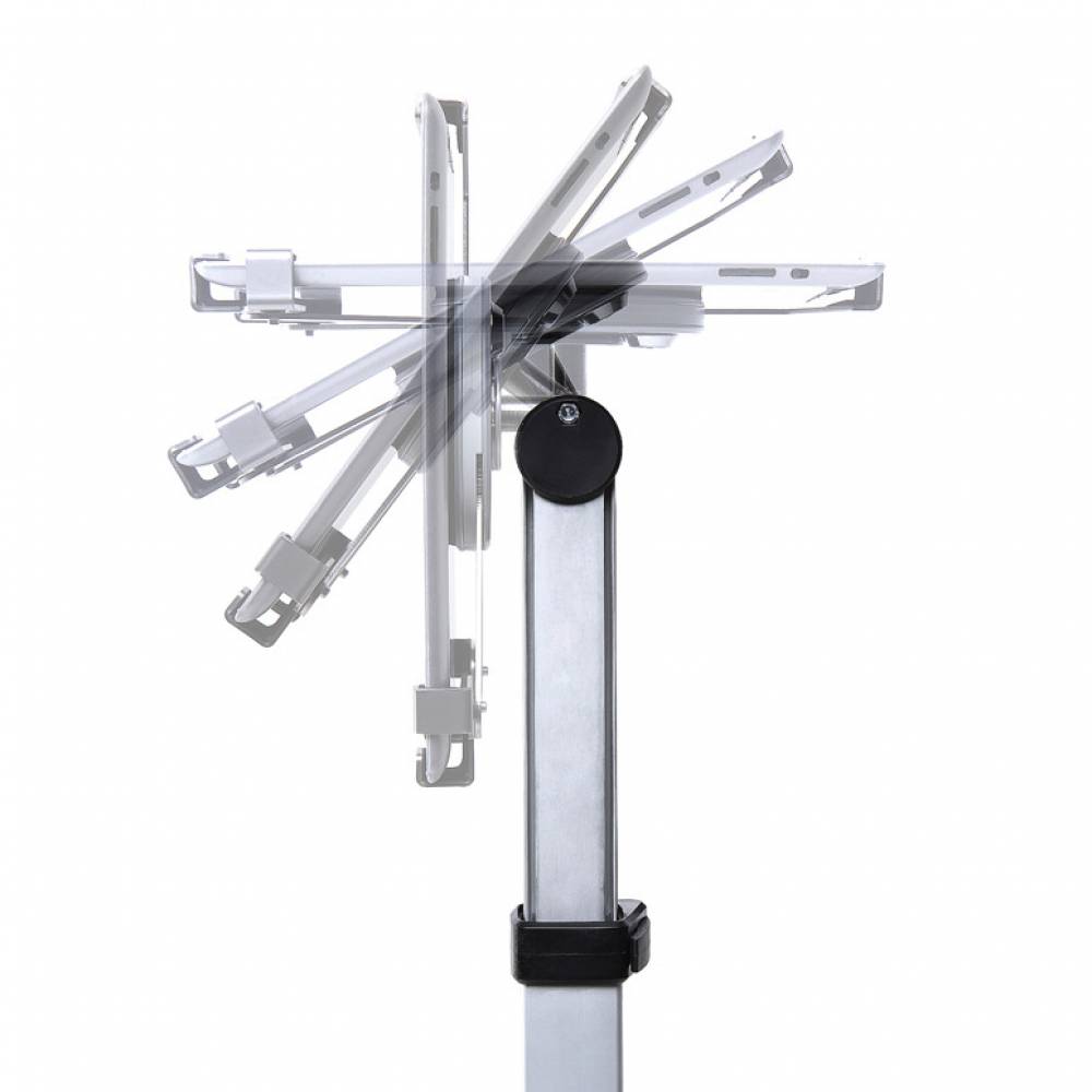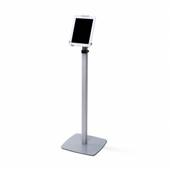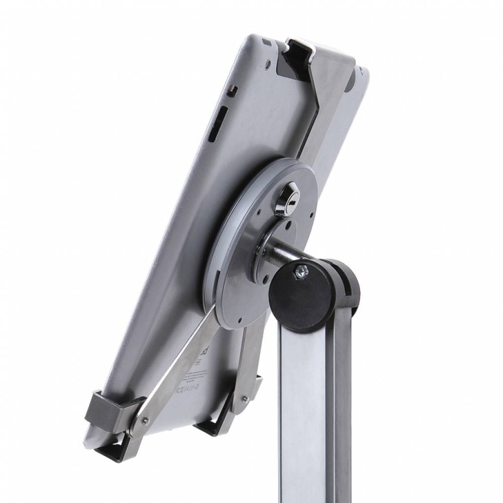 A TRIGRIP TELESZKÓPOS Tablettartó Állvány egy egyedi szabadon álló tablet tartó, Tri Grip zárral. Ezüst anodizált alumínium oszlop, állítható magasság 740 mm-től 1300 mm-ig a tabletjének rögzítésére. Nagy stabilitást biztosít a porfestett acél talplemez gumilábakkal. A tablet biztonságáról Kensigton zárak gondoskodnak. Az állítható szögnek köszönhetően a tabletet álló vagy fekvő formátumban lehet megjeleníteni. Kapható 10” és 13” méretű tabletekhez.