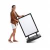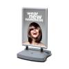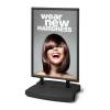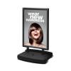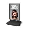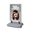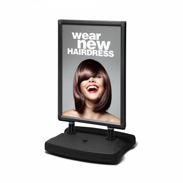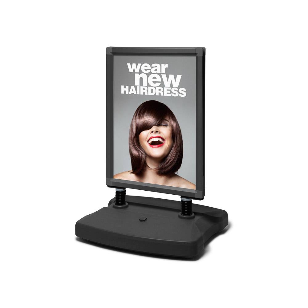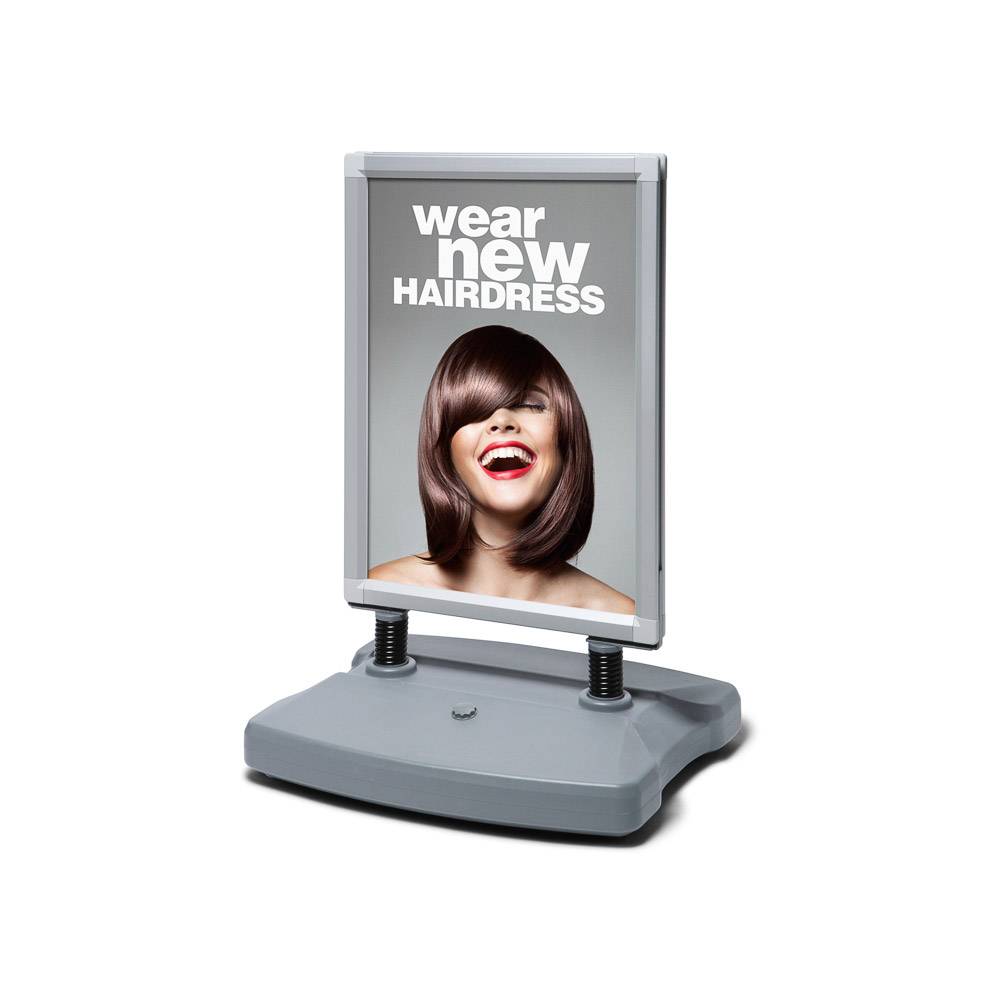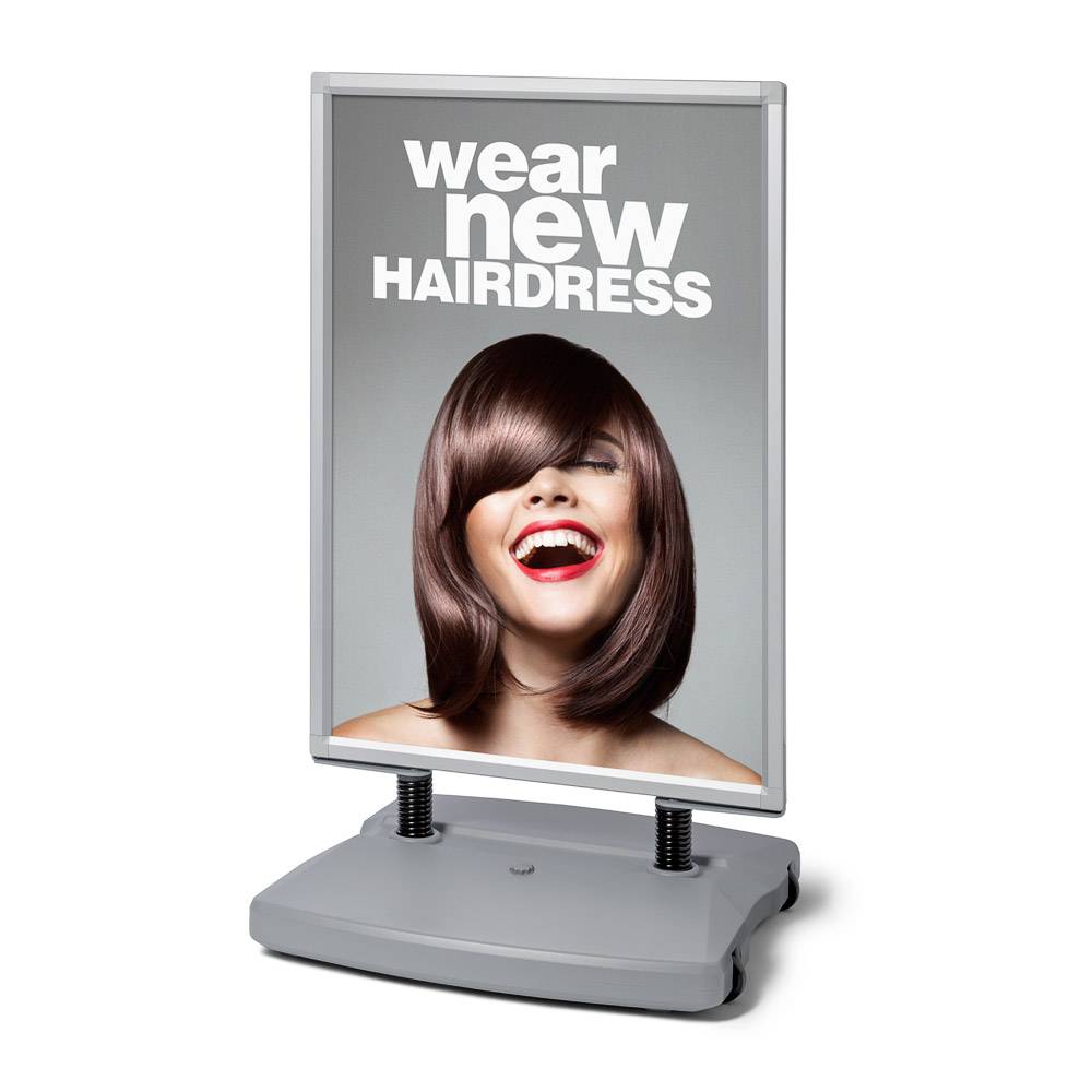 Érdemes a WINDTALKER® CITY Megállítótáblát választani, ha kültéri reklámozásra van szükség, mert kiváló stabilitást nyújt a vízzel vagy homokkal tölthető műanyag talpnak és a megerősített, magas minőségű acélrugóknak köszönhetően. A strapabíró középső panel ellenáll a rúgásoknak, ami növeli a termék élettartamát. A kétoldalas kialakítás lehetővé teszi, hogy hirdetése több irányból is jól látható legyen. Továbbá, a különböző méretekben és színekben (fekete vagy ezüst) elérhető változatok révén a termék könnyen testreszabható. Az opcionálisan hozzáadható szórólaptartó vagy topcard még inkább optimalizálja a hirdetési lehetőségeket, így biztosítva, hogy üzenete a lehető legnagyobb hatást érje el. A logó branding topcard kiegészítő lehetőség különösen hasznos, mivel egyszerűen felszerelhető, és mindkét oldalon jól láthatóvá teszi a márkáját, így növelve a láthatóságot bármilyen irányból.